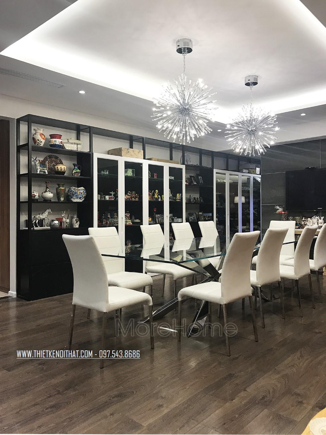 Thi công nội thất phòng ăn với bộ bàn ăn hiện đại 8 chỗ hiện đại, chân ghế được sử dụng với chất liệu gỗ inox cao cấp tạo sự chắc chắn cho người sử dụng. Chiếc bàn ăn được làm từ kihs cường lực an toàn, tinh tế, đèn chùm cách điệu…mang đến hững bữa ăn ngon miệng, ấm cũng hơn.