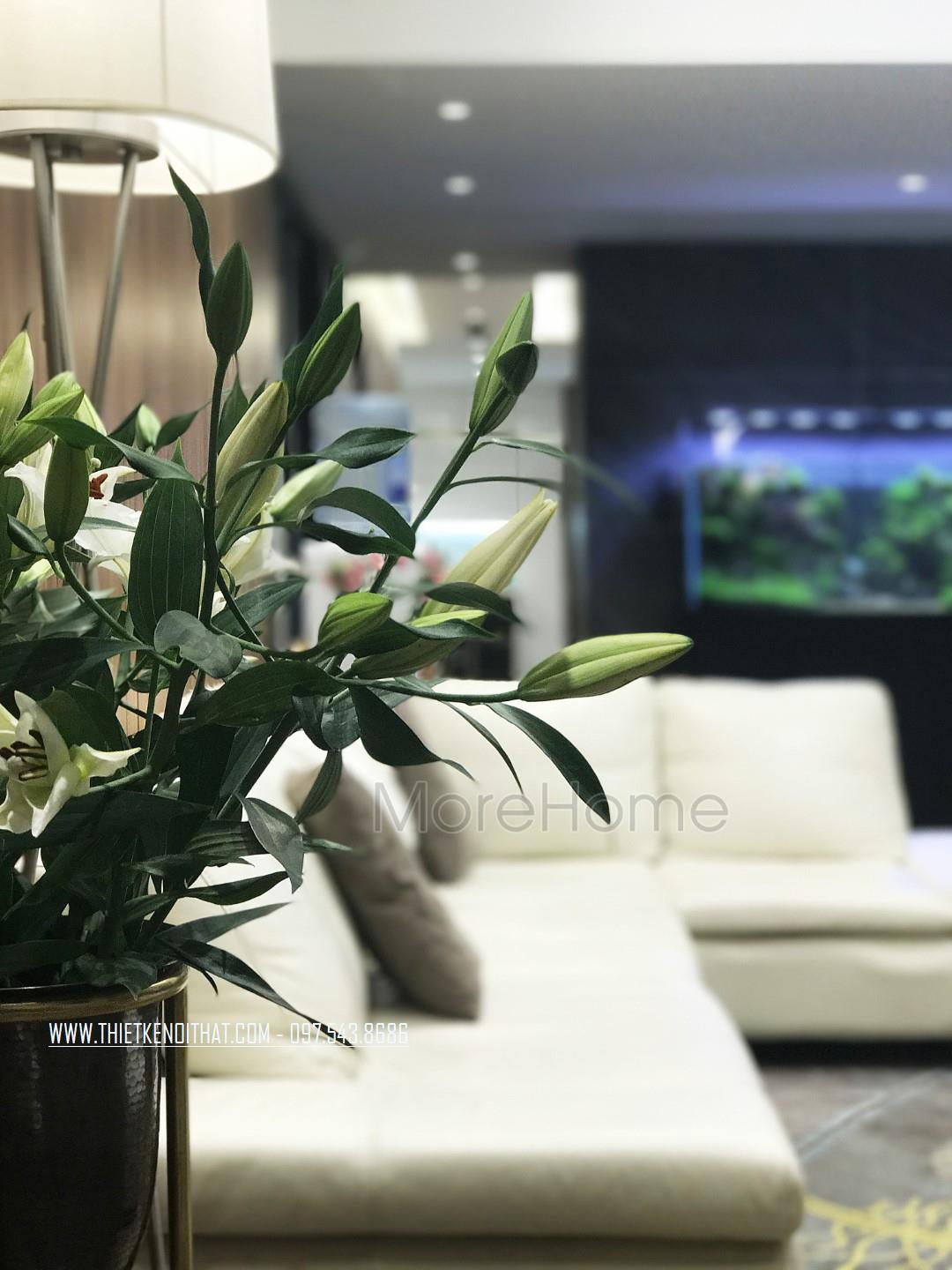 Ngay từ những bước chân đầu tiên vào khu chung cư này, bạn sẽ thấy vô cùng ấn tượng bởi không gian phòng khách. Thi công nội thất phòng khách chung cư với điểm nhấn chủ đạo là bộ sofa hiện đại màu trắng sữa, chiếc bàn trà décor được đặt chính giữa không gian tạo sự tinh tế, nổi bật cho căn phòng.