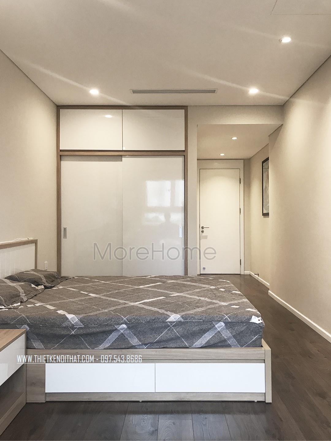 Thi công nội thất phòng ngủ theo xu hướng tối giản hóa. Nhằm mang đến cho gia chủ không gian nghỉ ngơi rộng và thoáng, kiến trúc sư đã sử dụng kiểu thiết kế âm tường, từ tủ quần áo cho tới ti vi, bàn trang điểm tích hợp với chức năng của bàn làm việc tạo nên sự tiện dụng nhất.