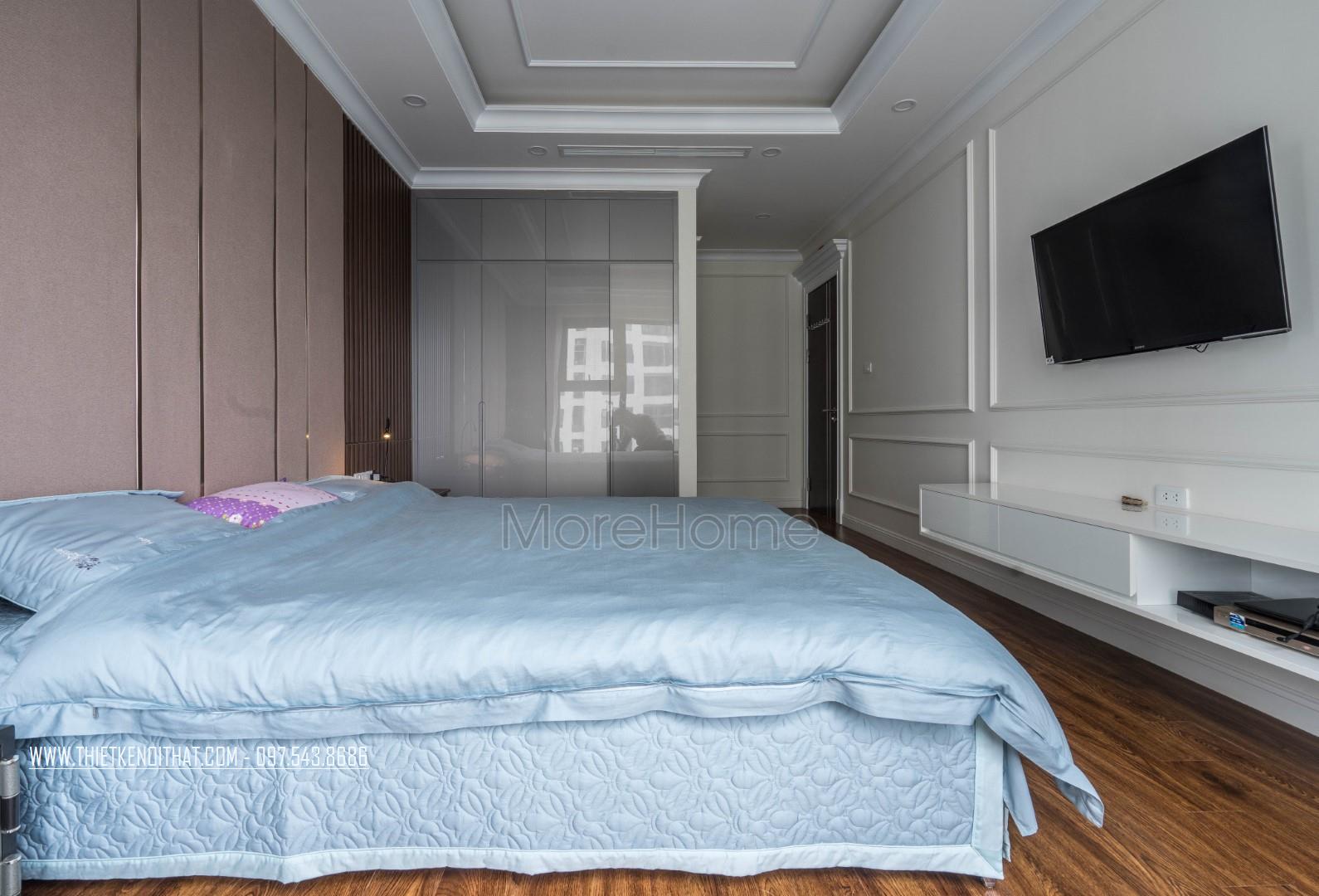 Thi công nội thất phòng ngủ bố mẹ hiện đại, thoải mái với gam màu trắng và xanh dương đan xen tinh tế. Phòng ngủ được thiết kế đơn giản, chiếc giường ngủ hiện đại bọc vải, phần táp đầu giường nhiều ngăn với nhiều công năng sử dụng, tủ quần áo được thiết kế âm tường tạo độ rộng và thoáng cho cả không gian này.