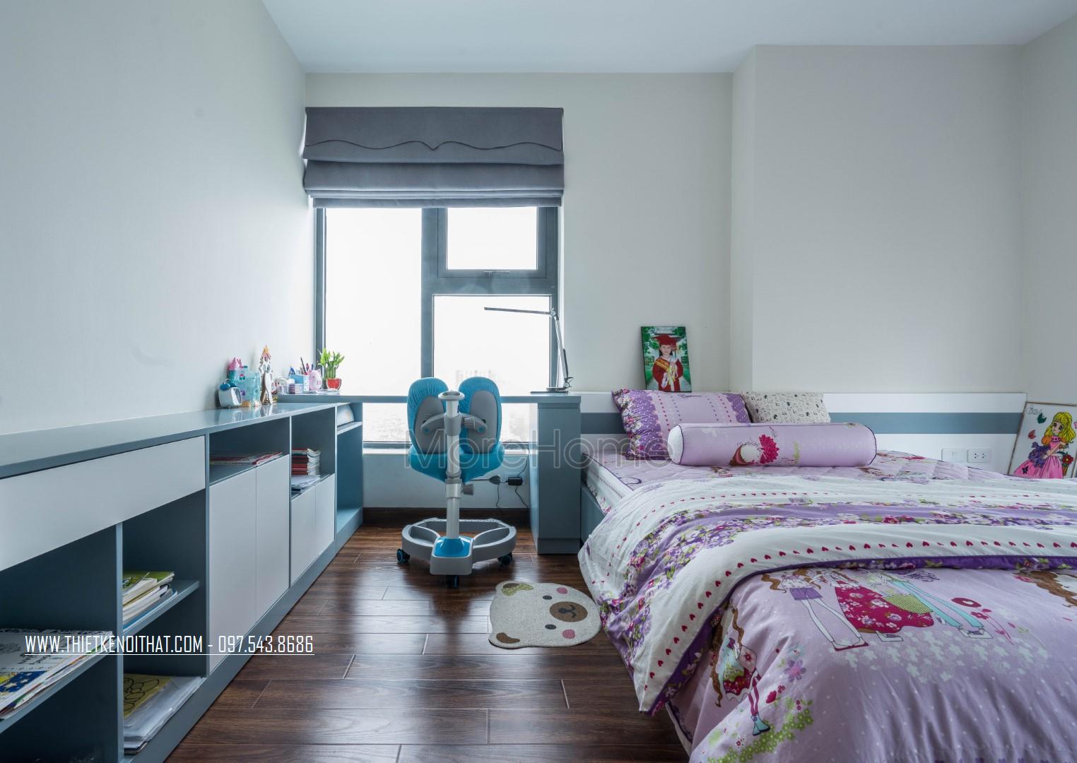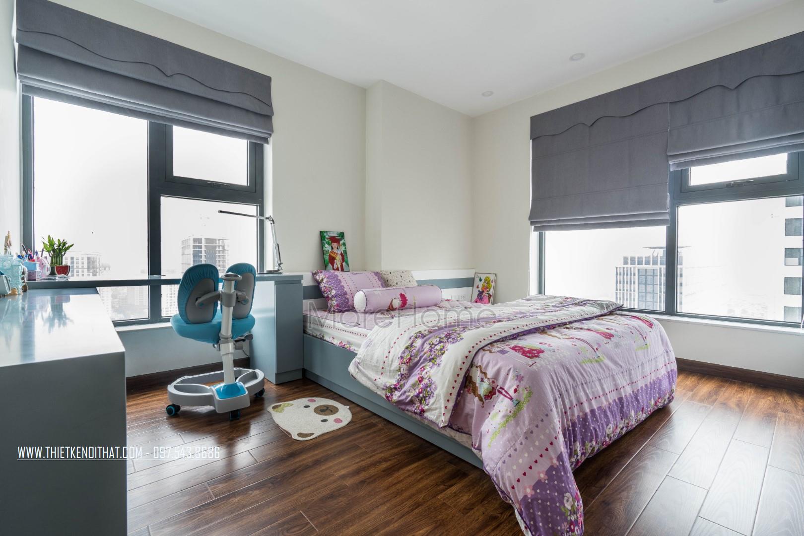 Phòng ngủ con gái nhẹ nhàng, vô cùng đáng yêu. Nội thất được sắp xếp 1 cách hợp lí, bàn học được thiết kế ngay cạnh cửa sổ, liền kề với nó là chất liệu giường ngủ cùng màu, tạo cho con có một không gian vừa học vừa chơi thoải mái nhất.