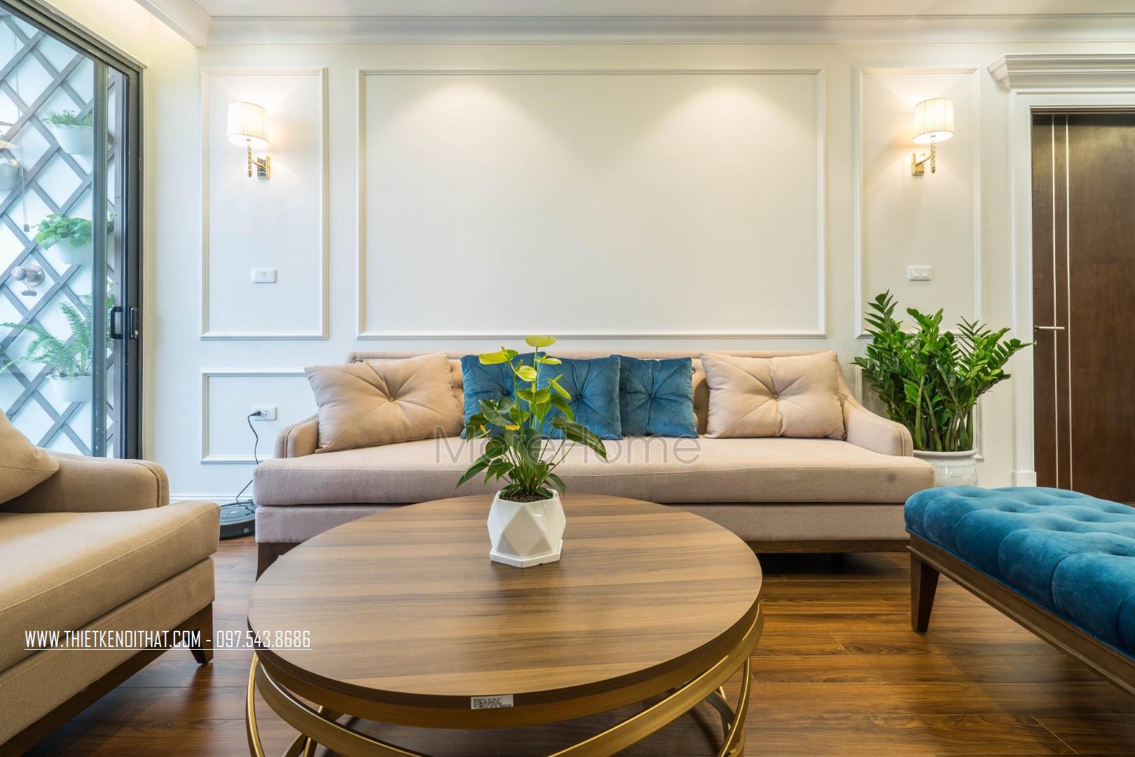 Thi công nội thất chung cư tại An Bình City mang đậm phong cách hiện đại với màu sắc tinh tế và sang trọng. Phòng khách chung cư ấn tượng với bộ sofa hiện đại màu trắng sữa, chiếc đôn sofa màu xanh coi như là điểm nhấn của cả không gian này. Chiếc bàn trà hình tròn được làm kết hợp từ gỗ tự nhiên cùng khung chân sắt tĩnh điện cao cấp được đặt ở chính giữa không gian. Kiến trúc sư cũng áp dụng xu hướng đưa không gian xanh vào trong mẫu thiết kế này, không chỉ điều hòa không khí, tạo sự sang trọng, mát mẻ cho không gian, nó còn mang ý nghĩa mang lại tài lộc cho gia chủ.