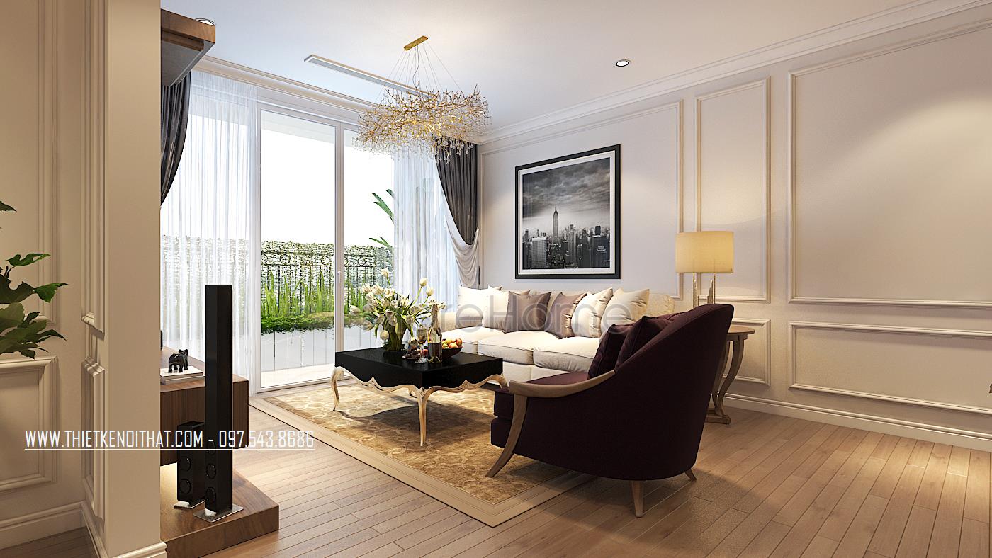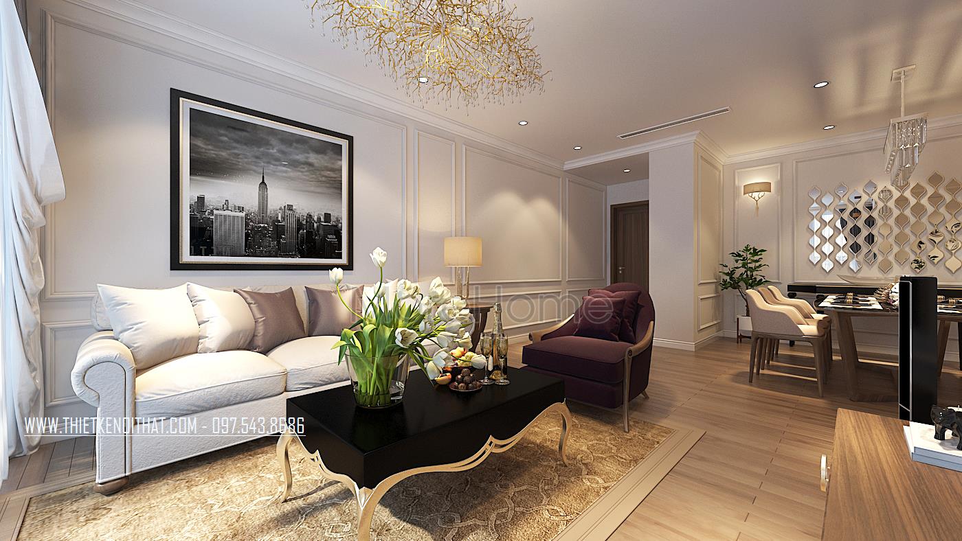 Ở không gian phòng khách, kiến trúc sư sử dụng tone màu sữa làm chủ đạo. Bộ sofa tân cổ điển đơn giản mà sang trọng, đi liền với nó là chiếc sofa đơn bọc nỉ màu đỏ được coi như là điểm nhấn của không gian này. Bàn trà được đặt chính giữa, được thiết kế với chất liệu inox cao cấp được sơn mạ vàng, mặt bàn được sơn đen bóng trông vô cùng sang trọng và kiểu cách. Trên tường là hệ thống phào chỉ chia ô khéo léo, tạo không gian rộng hơn, bức tranh đen trắng cũng để lại ấn tượng với mọi ánh nhìn…Tất cả kết hợp một cách hài hòa tạo độ cân bằng vè màu sắc ở tổng thể không gian này.