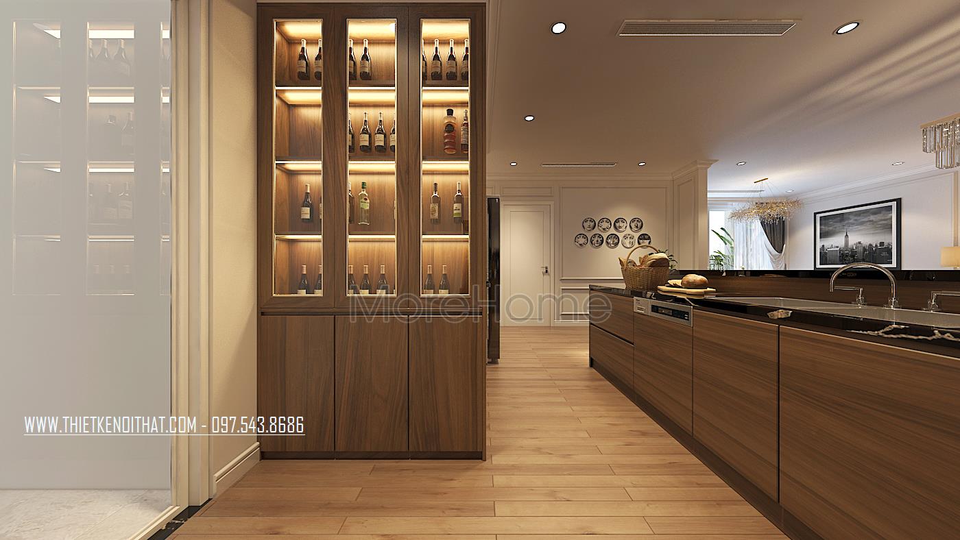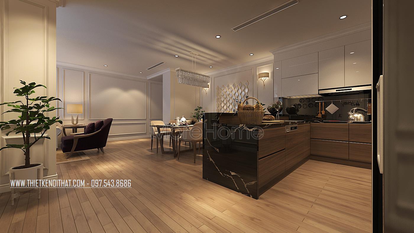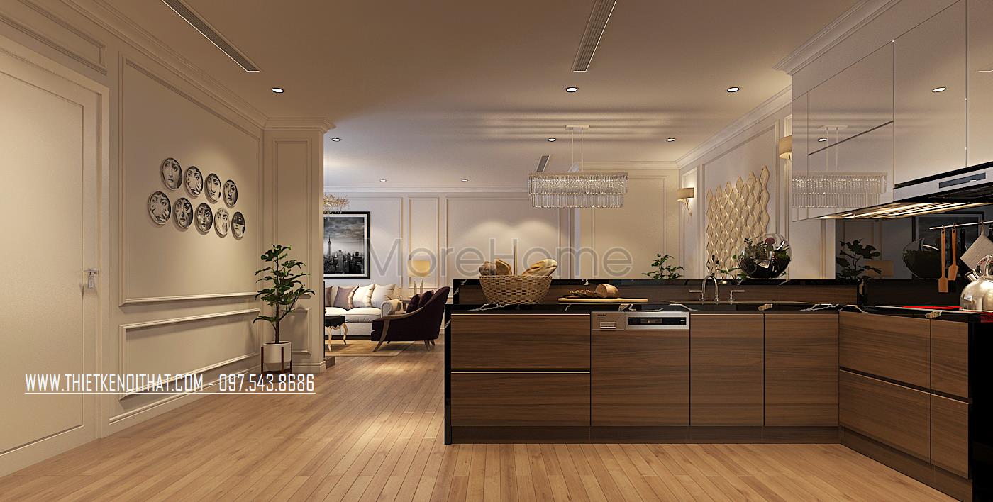 Đi sâu vào bên trong là phòng bếp của chung cư cao cấp này. Hệ tủ bếp kiểu dáng hiện đại được thiết kế theo kiểu dáng chữ L tinh tế, với khu vực bếp nóng và khu vực sơ chế thực phẩm được bố trí khoa học, các phần tủ thiết kế nhiều ngăn giúp cho những người nội trợ thuận tiện hơn trong việc lưu trữ thực phẩm, dụng cụ nấu nướng…Phần trên mặt tủ được ốp đá cao cấp, mặt sàn ốp gỗ tạo sự sang chảnh cho khu vực này.