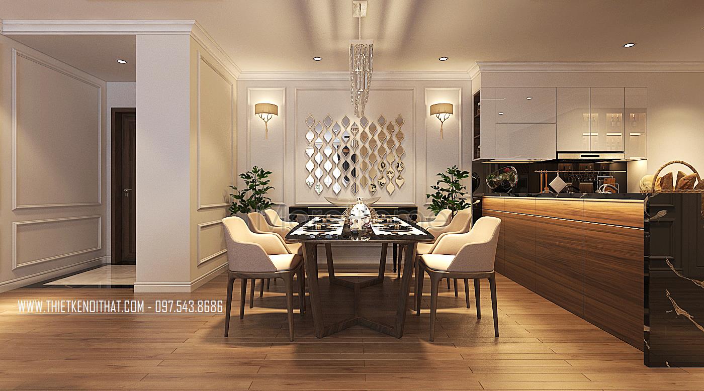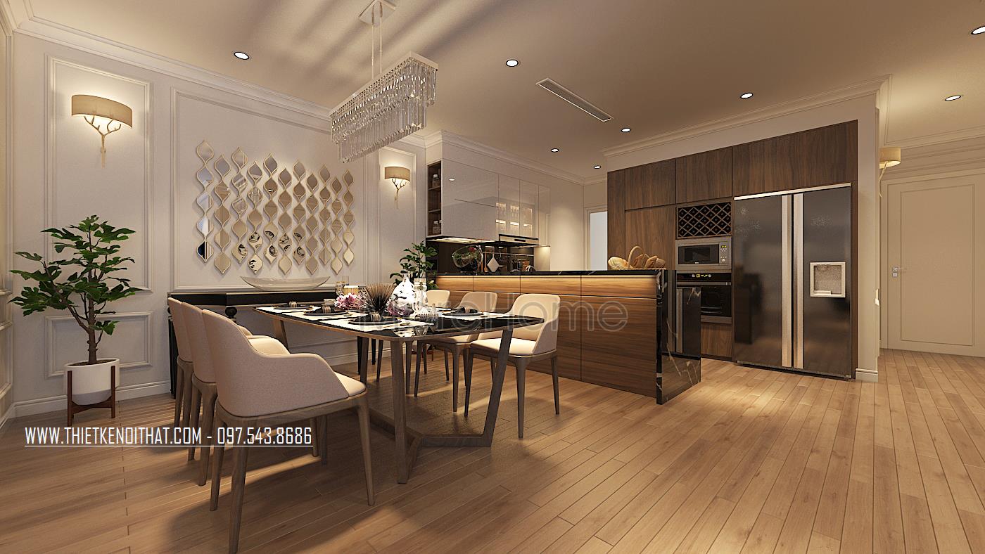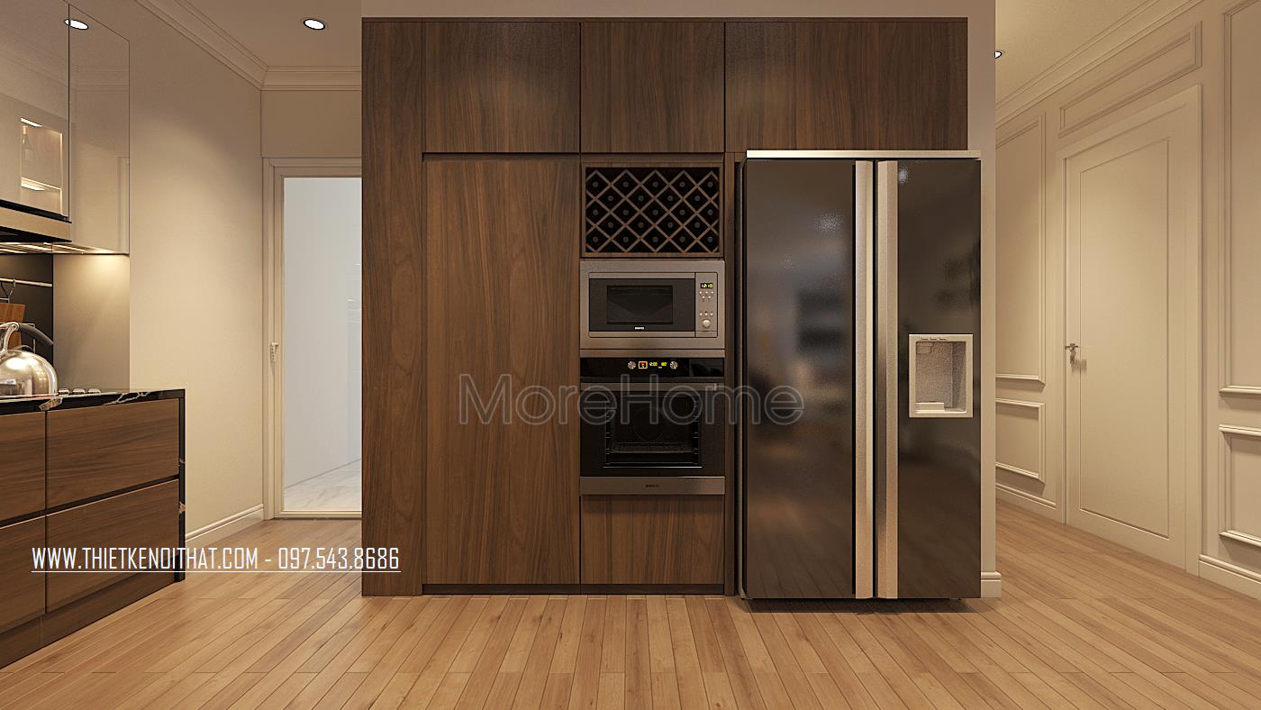 Đi sâu vào bên trong là phòng bếp của chung cư cao cấp này. Hệ tủ bếp kiểu dáng hiện đại được thiết kế theo kiểu dáng chữ L tinh tế, với khu vực bếp nóng và khu vực sơ chế thực phẩm được bố trí khoa học, các phần tủ thiết kế nhiều ngăn giúp cho những người nội trợ thuận tiện hơn trong việc lưu trữ thực phẩm, dụng cụ nấu nướng…Phần trên mặt tủ được ốp đá cao cấp, mặt sàn ốp gỗ tạo sự sang chảnh cho khu vực này.