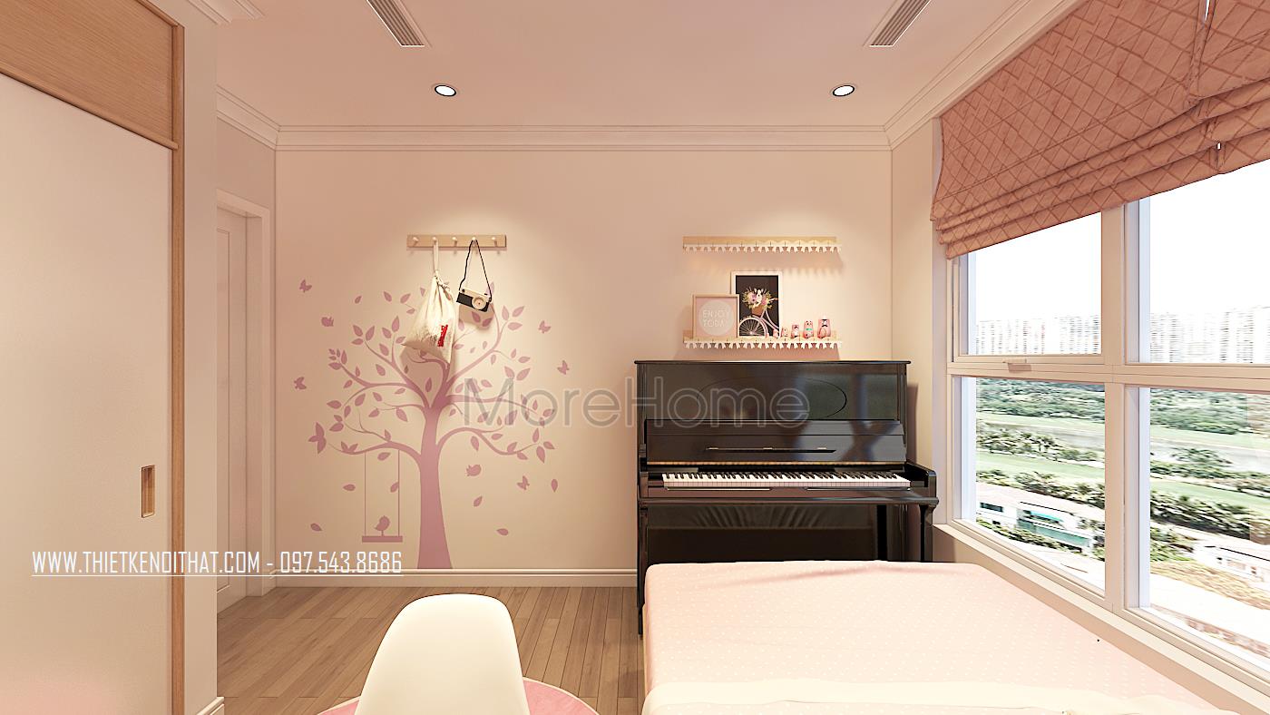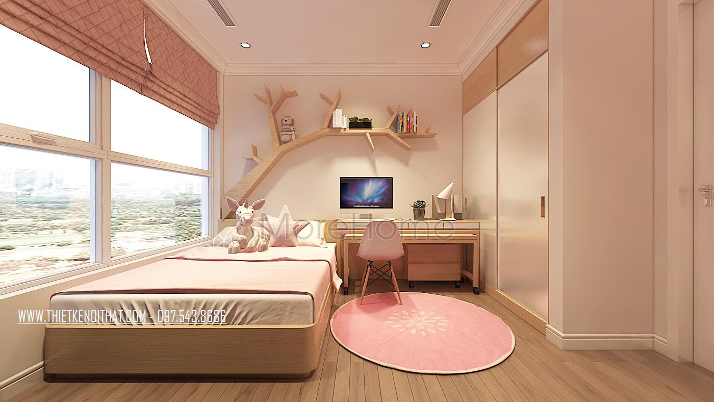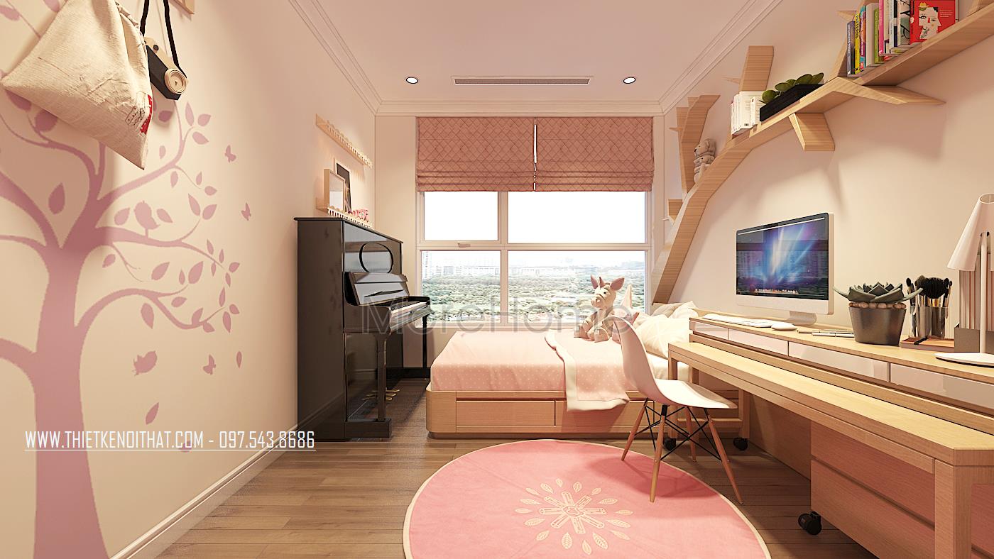 Phòng ngủ bé gái với tone màu hồng phấn dễ thương. Ở không gian này, gia chủ có thể lựa chọn mẫu gỗ công nghiệp để trang trí nội thất cho căn phòng là phù hợp(bởi gỗ công nghiệp nhẹ nhàng, nhiều mẫu mã, màu sắc, bạn sẽ dễ lựa chọn cho con của bạn, đồng thời sẽ tiết kiệm được khoản chi phí cho gia đình mình. Phần tủ quần áo thiết kế âm tường tạo cho không gian rộng và thoáng hơn.