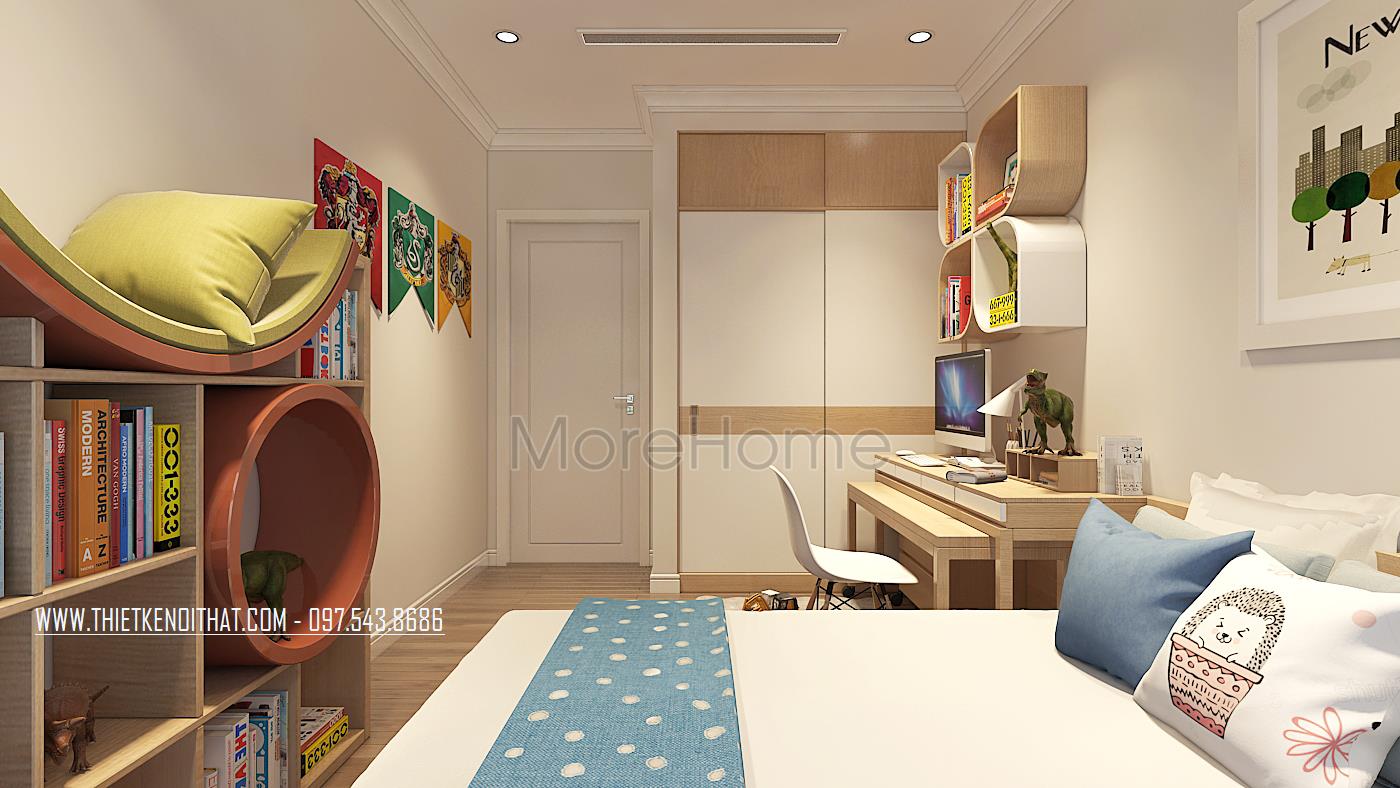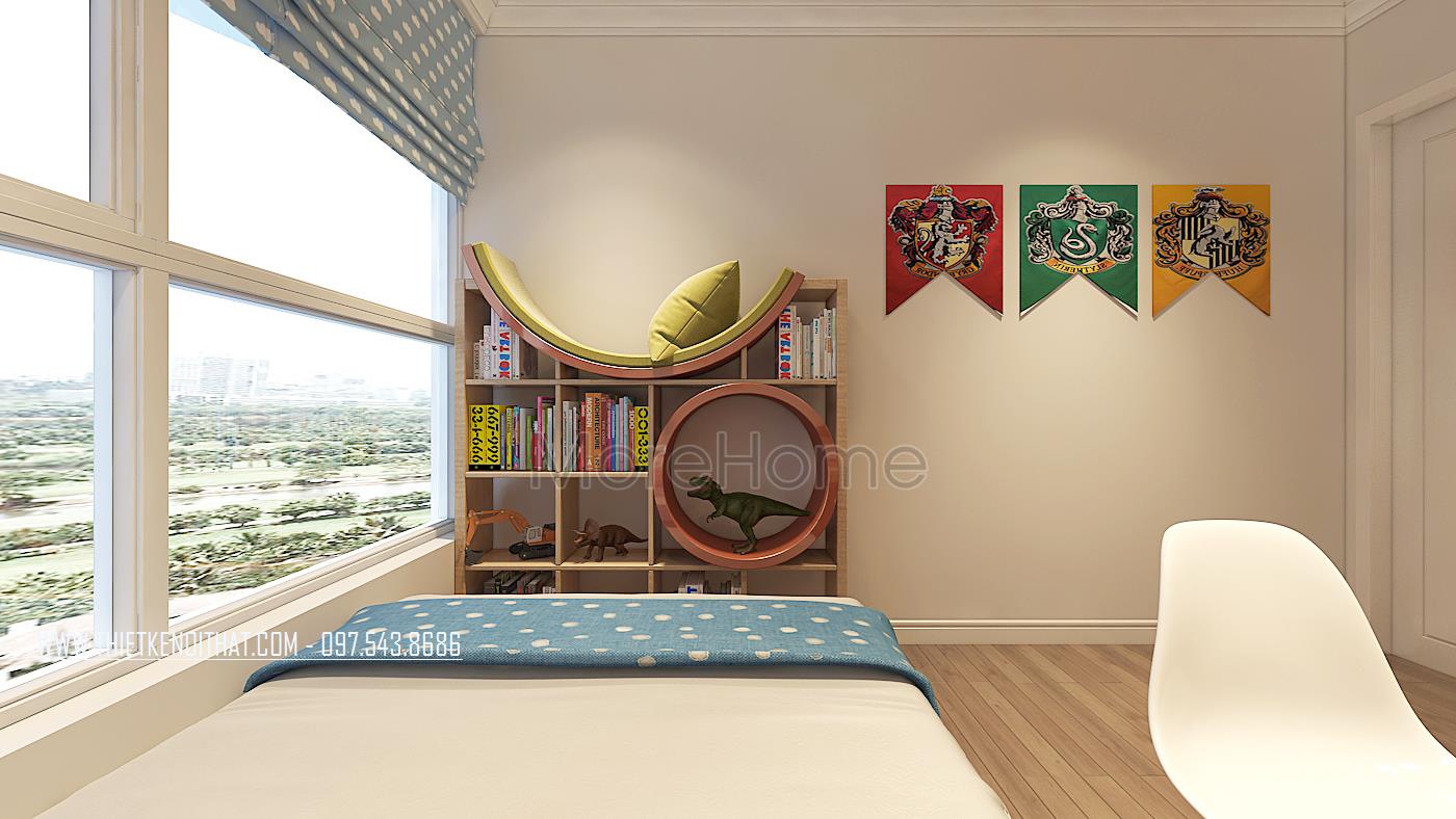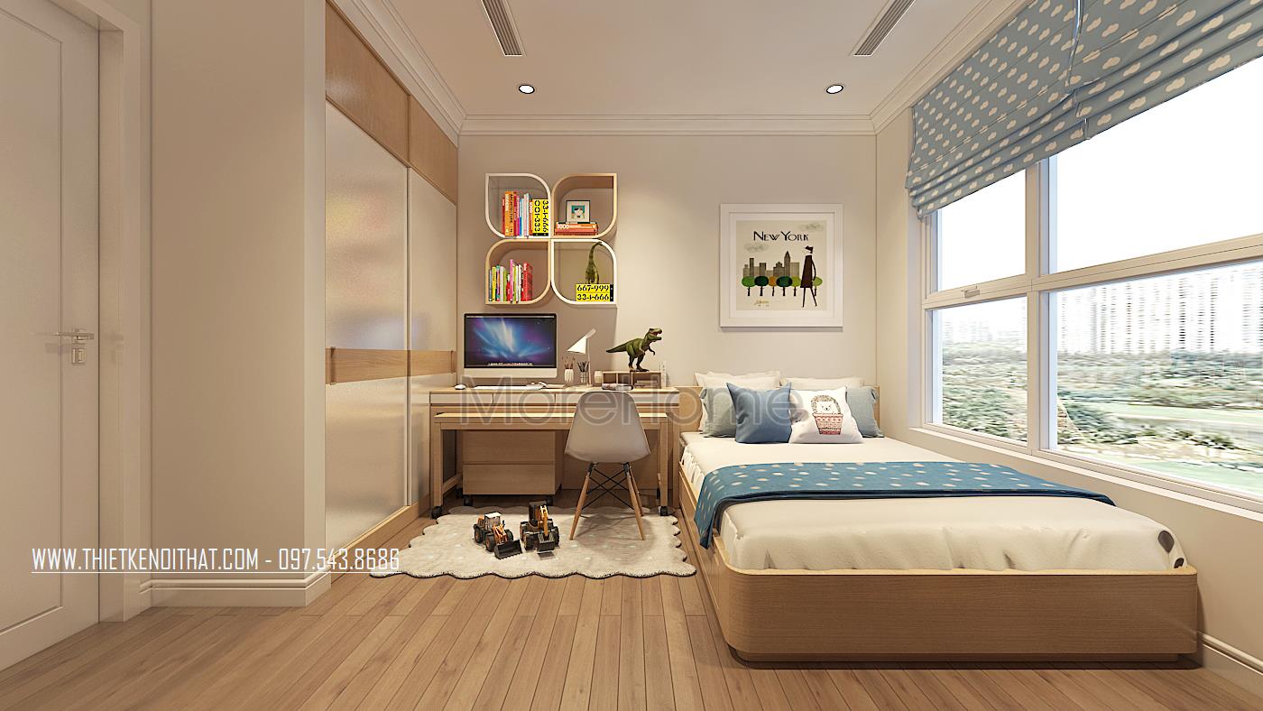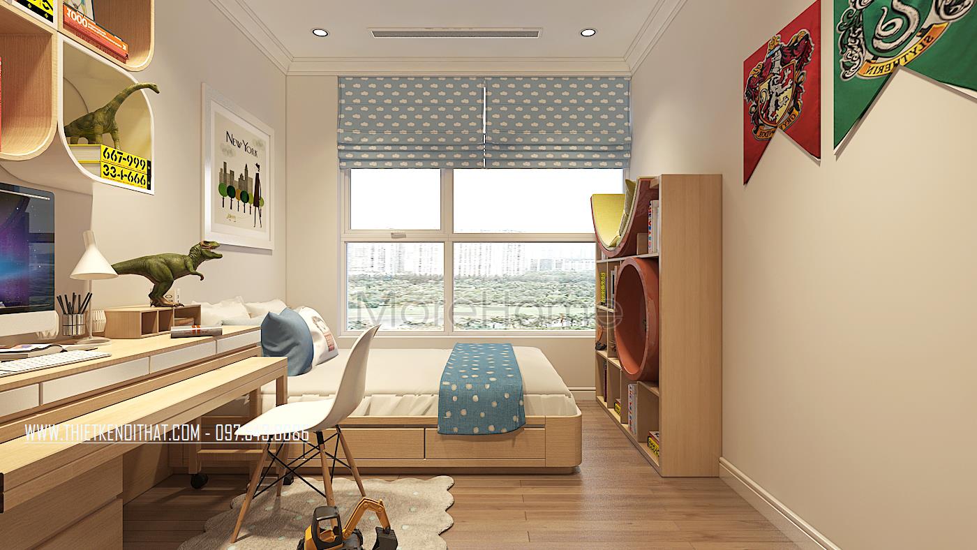 Khác với phòng ngủ con gái, ở mẫu phòng ngủ của con trai trong mẫu thiết kế chung cư này sử dụng tone màu xanh để làm điểm nhấn cho căn phòng. Nội thất gỗ màu sáng kết hợp với màu xanh của rèm cửa, chăn, cùng những màu sắc khác tạo không gian vô cùng năng động, sáng tạo, phù hợp với cá tính tinh nghịch của bé trai.