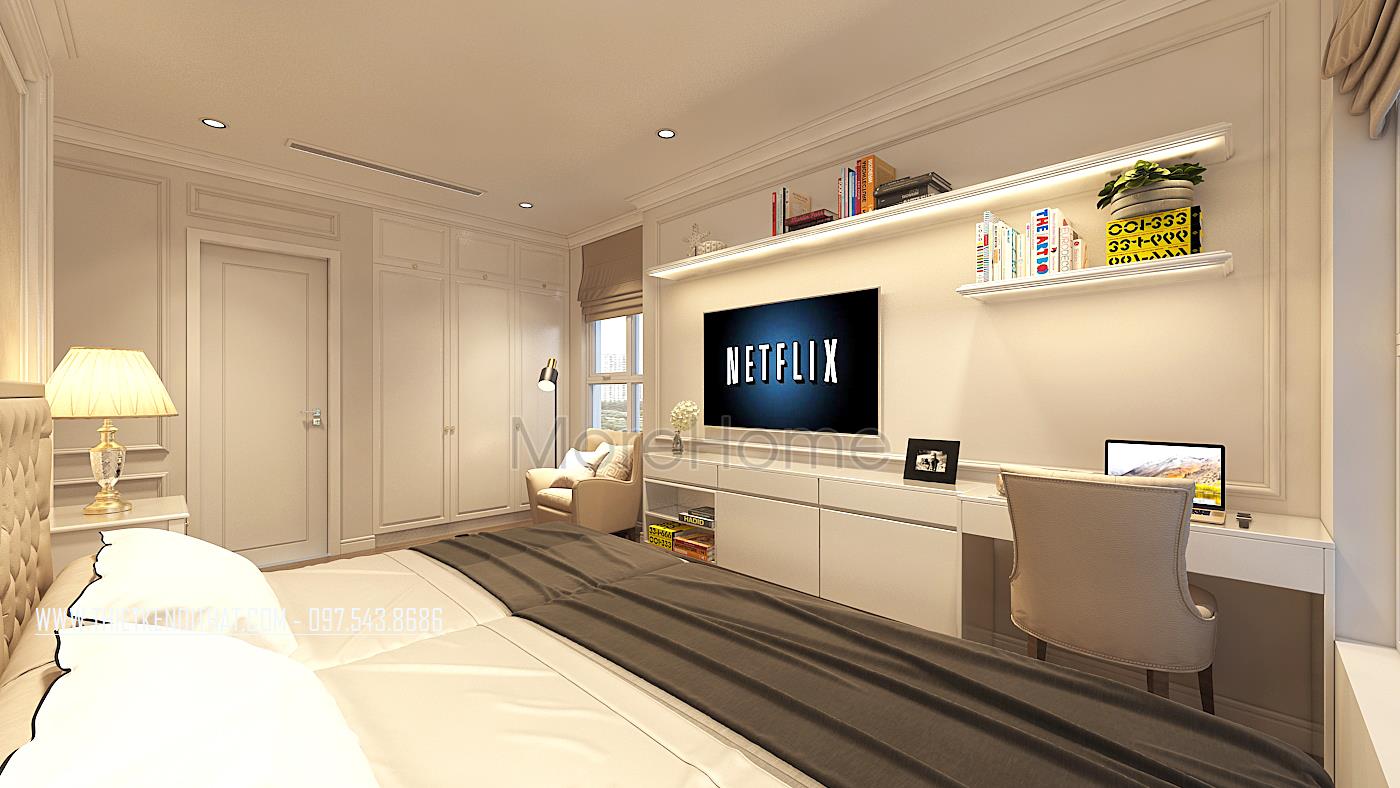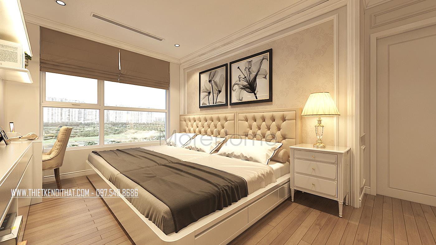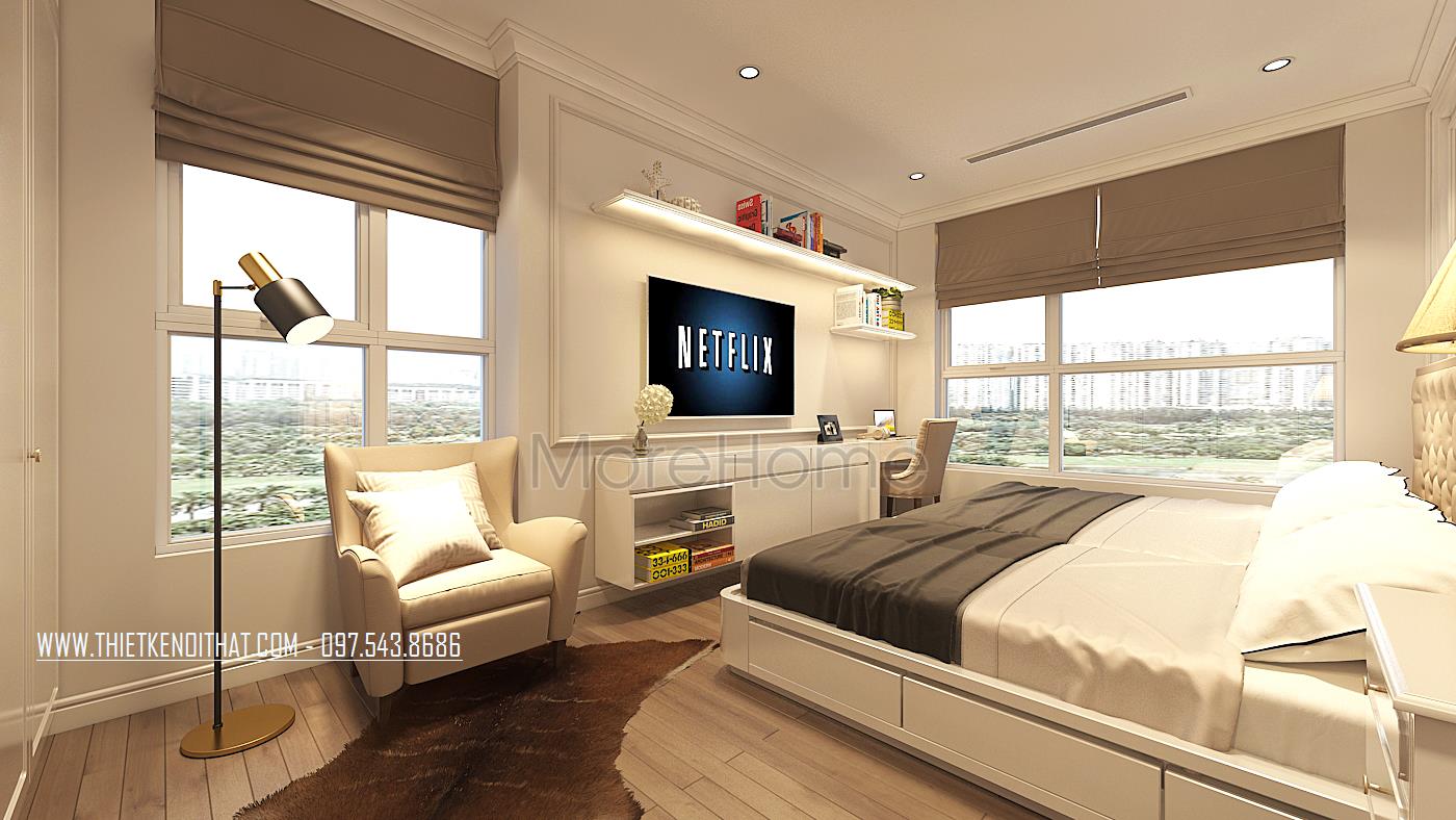 Vẫn sử dụng tone màu trắng sữa làm chủ đạo, những nhà kiến trúc sư đã mang đến cho gia chủ không gian nghỉ ngơi thoải mái nhất. Giường ngủ được thiết kế với khung gỗ phun sơn trắng, với 3 ngăn kéo rất tiện lợi. Phần kệ tivi thiết kế liền với bàn làm việc tạo sự liền mạch cho không gian này. Phần cửa sổ được thiết kế với khoảng cách lớn, tiếp xúc tối đa với ánh sáng tự nhiên, tạo cho không gian luôn ấm áp, năng động…