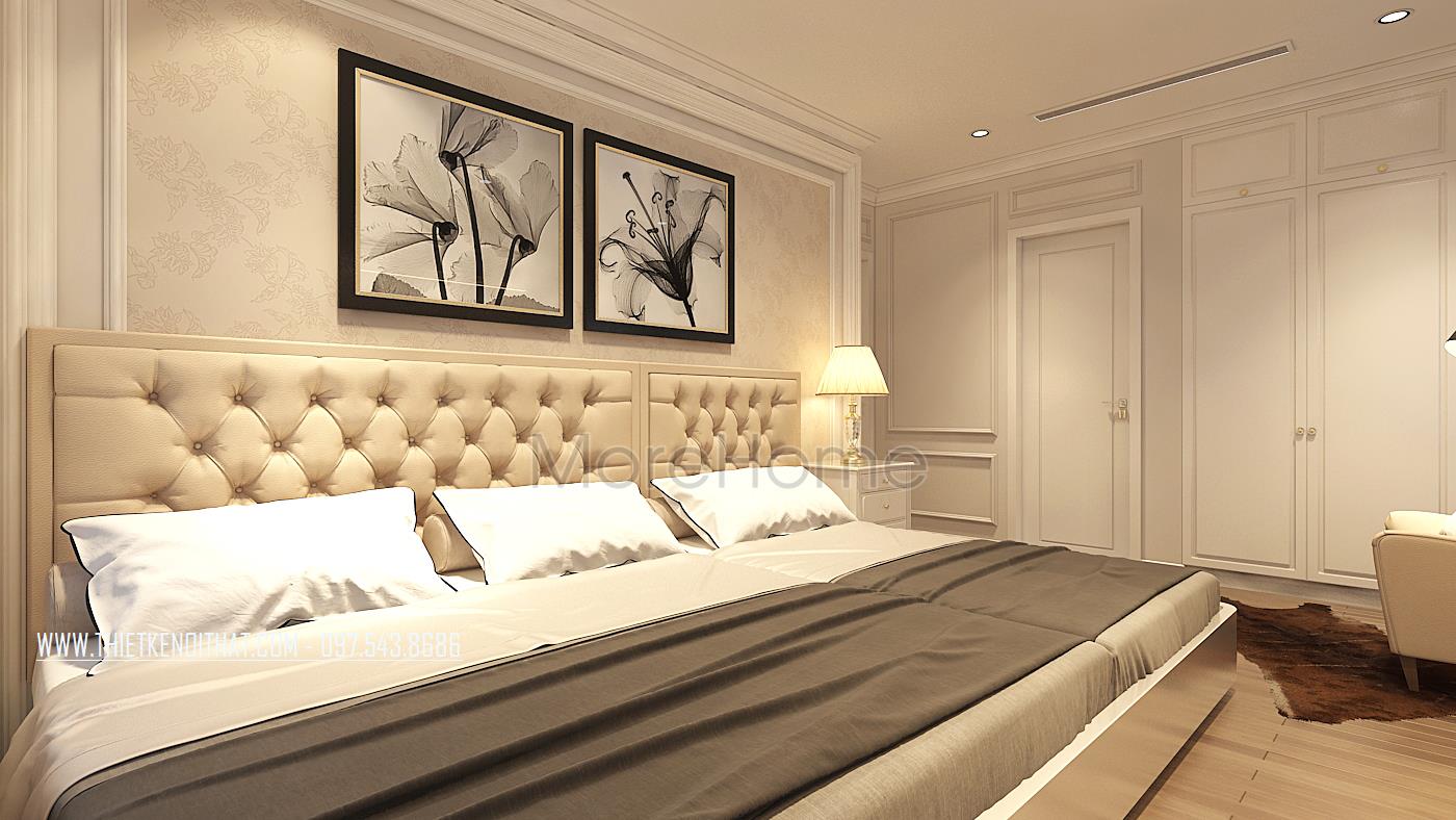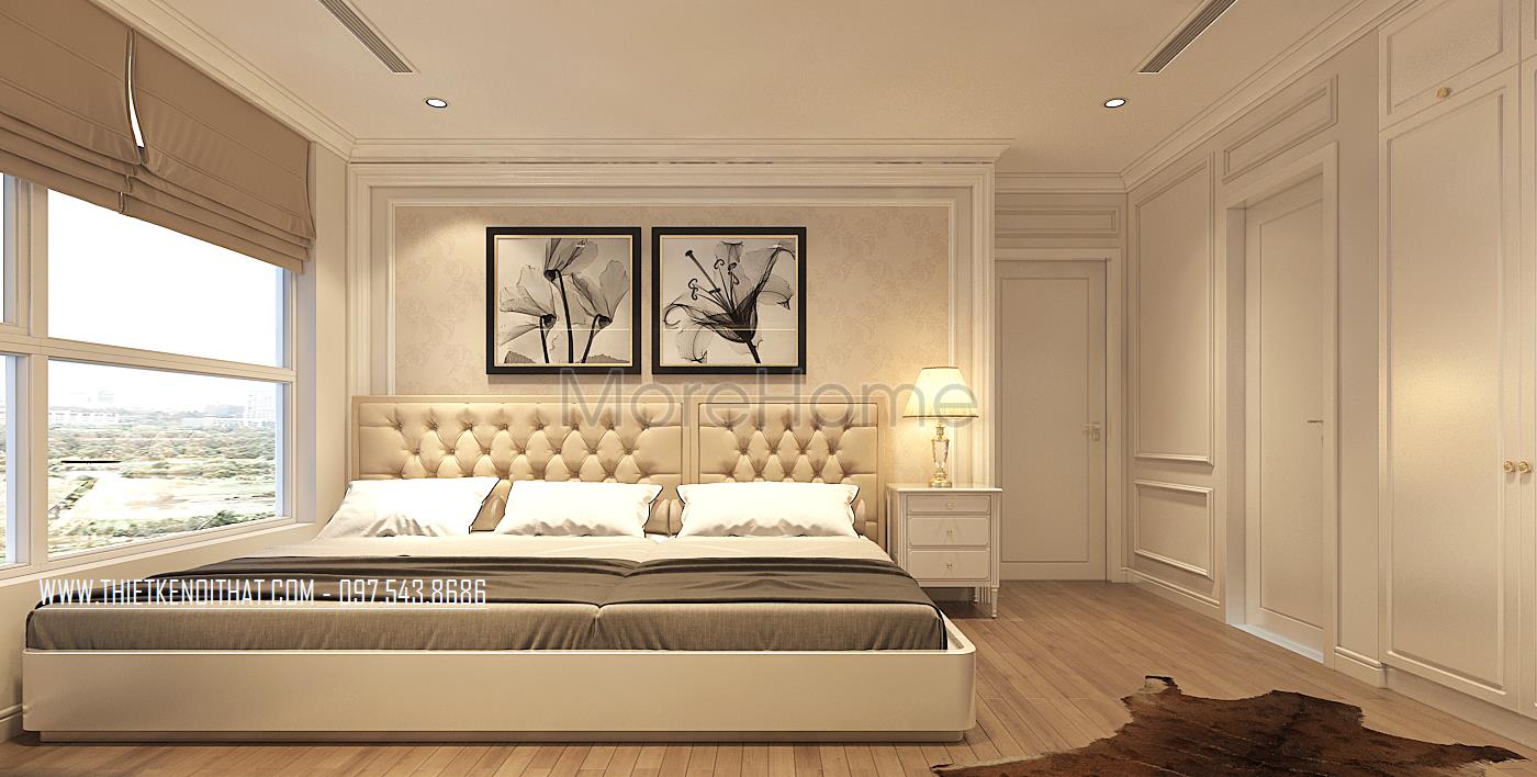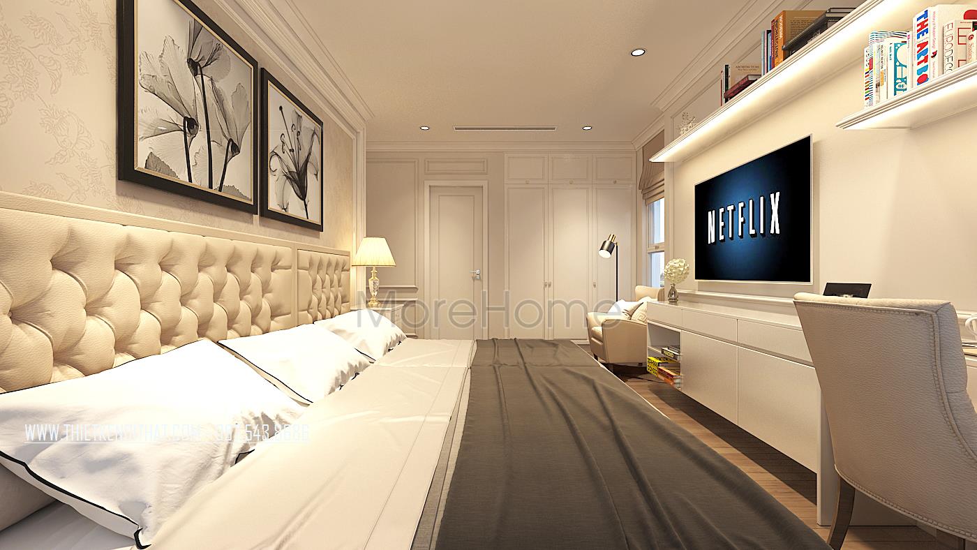 Vẫn sử dụng tone màu trắng sữa làm chủ đạo, những nhà kiến trúc sư đã mang đến cho gia chủ không gian nghỉ ngơi thoải mái nhất. Giường ngủ được thiết kế với khung gỗ phun sơn trắng, với 3 ngăn kéo rất tiện lợi. Phần kệ tivi thiết kế liền với bàn làm việc tạo sự liền mạch cho không gian này. Phần cửa sổ được thiết kế với khoảng cách lớn, tiếp xúc tối đa với ánh sáng tự nhiên, tạo cho không gian luôn ấm áp, năng động…