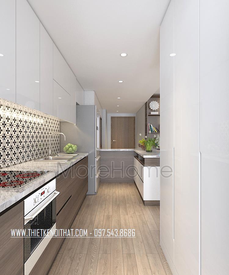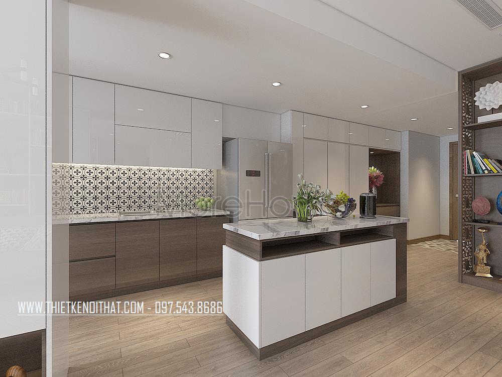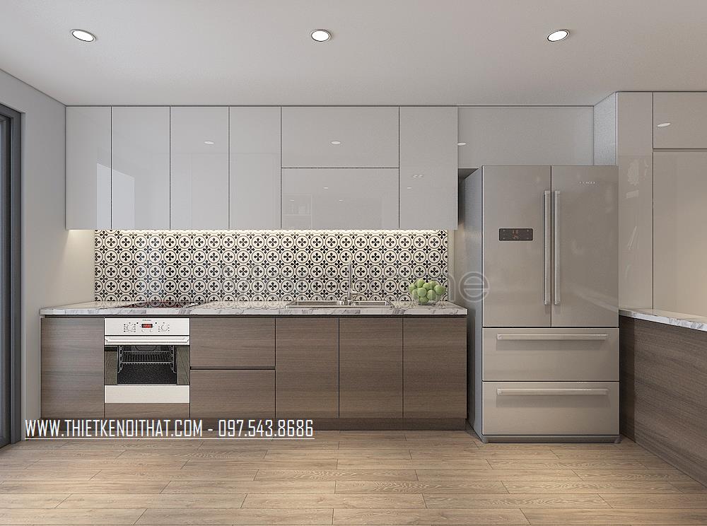 Thiết kế nội thất phòng bếp với hệ tủ chữ I độc đáo, với chất liệu gỗ công nhiệp nhẹ nhàng, các phần ngăn được phân chia đều với đầy đủ công năng. Phần mặt tủ được sửa dụng bằng đá ốp nhân tạo mang lại cho không gian bếp vô cùng sạch sẽ mà sang trọng.