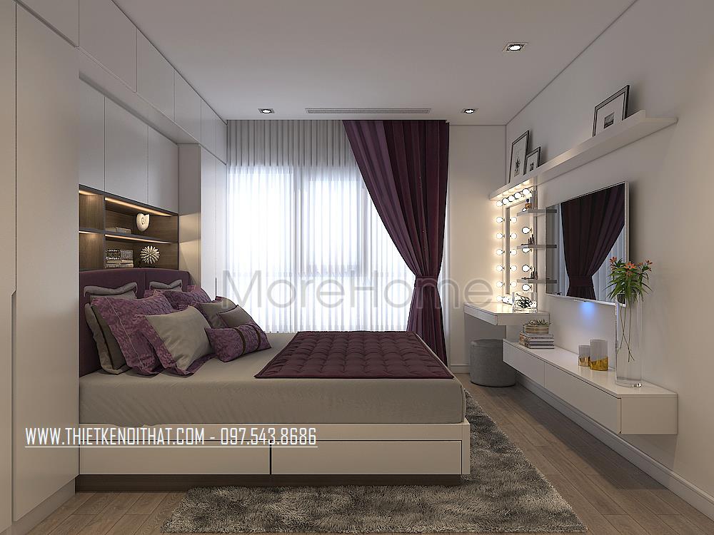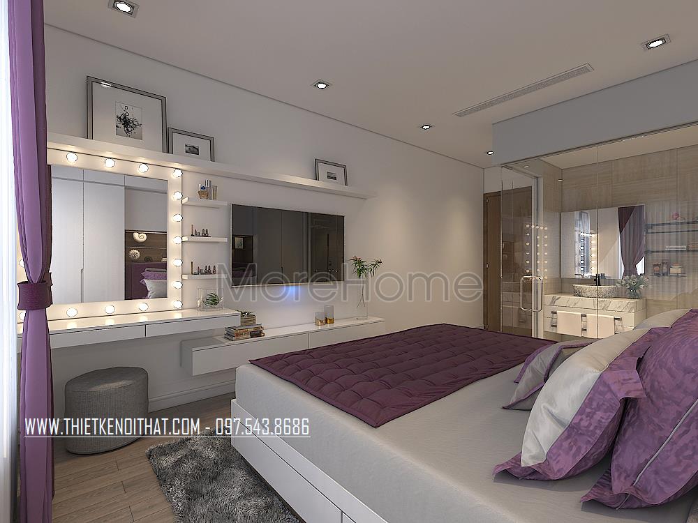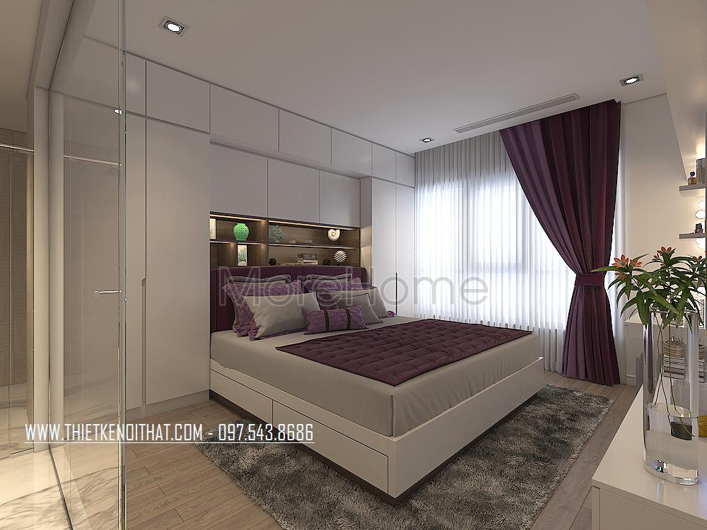 Thiết kế nội thất phòng ngủ hiện đại, sang trọng mà thoải mái. Chiếc giường trở thành điểm nhấn nổi bật của không gian này. Phần tủ quần áo được thiết kế âm tường tạo sự thông thoáng cho căn phòng.