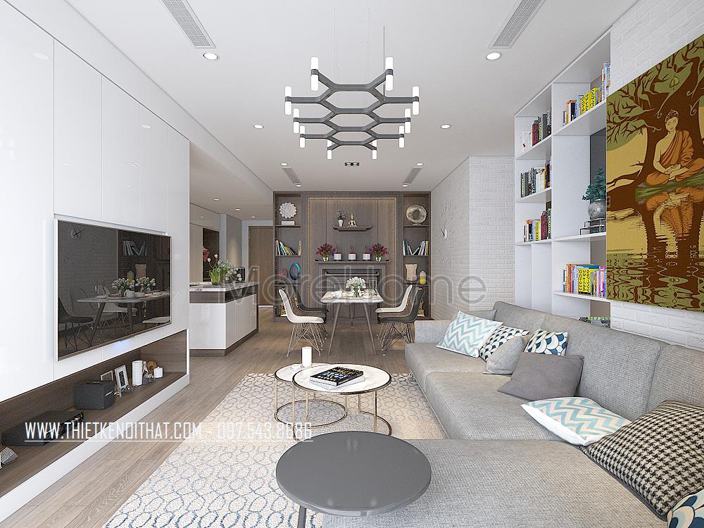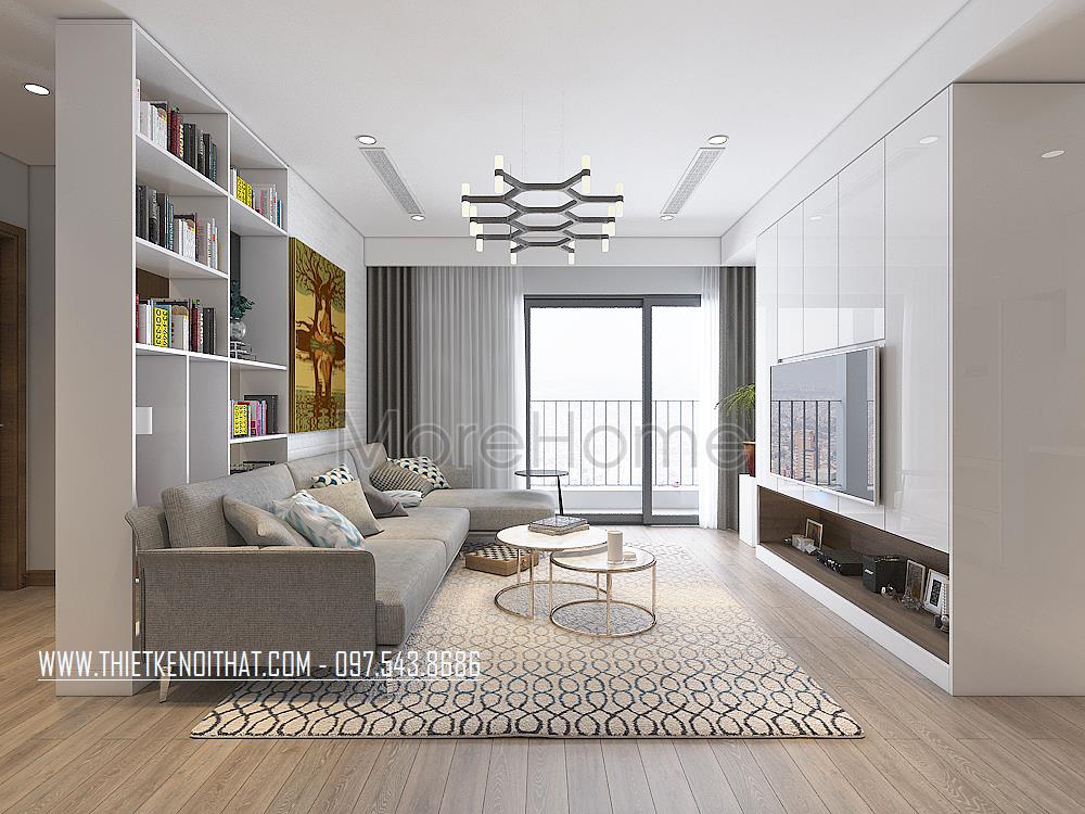 Vẫn như những chung cư khác, ở mẫu thiết kế nội thất chung cư này, phòng khách là không gian được đầu tư khá nhiều. Ấn tượng ở khu vực này chính là bộ sofa hiện đại bọc vải màu xám tinh tế - đây là một trong những mẫu sofa đẹp đang được ưa chuộng hiện nay. Phía sau sofa được thiết kế thêm chiếc giá sách nhiều ngăn giúp cho gia chủ thuận tiện trong việc đọc sách, lưu trữ sách hay các vật décor trang trí…Đối diện đó là phần ti vi kết hợp với phần kệ tủ mới lạ, tận dụng được triệt để không gian để đồ. Phần ban công thay vì sử dụng cửa gỗ nặng nề, kiến trúc sư đã thay thế bằng cửa kính cường lực an toàn với khoảng cách lớn, tạo cho không gian phòng khách luôn tận dụng được tối đa ánh sáng tự nhiên, tạo sự năng động, thoải mái cho không gian này.