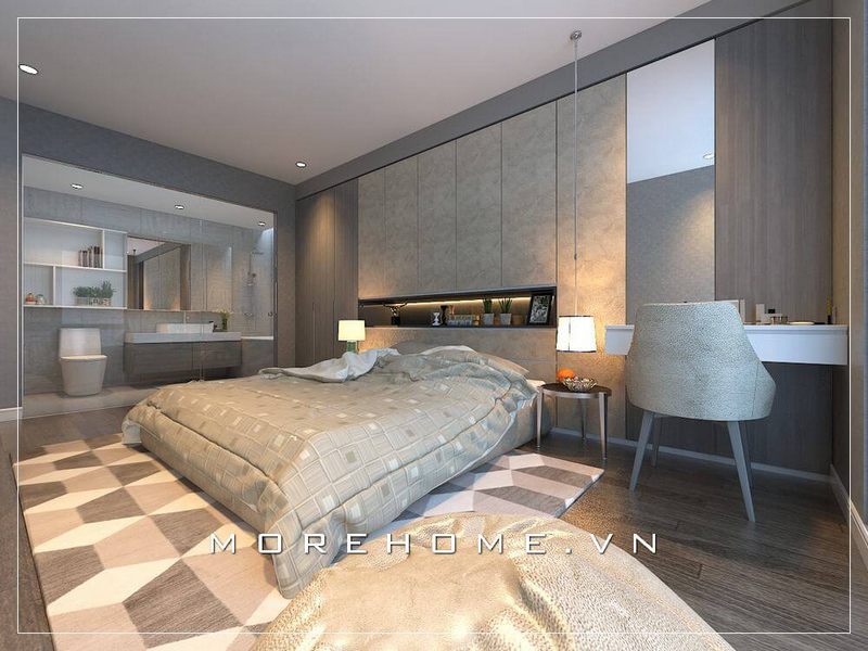Trang trí phòng ngủ chung cư hiện đại với chiếc giường xám hiện đại tinh tế