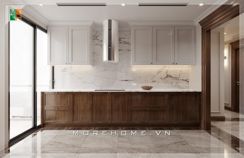 Trang trí nội thất phòng bếp sang trọng ấn tượng với bộ tủ bếp tân cổ điển cao cấp, quý phái.