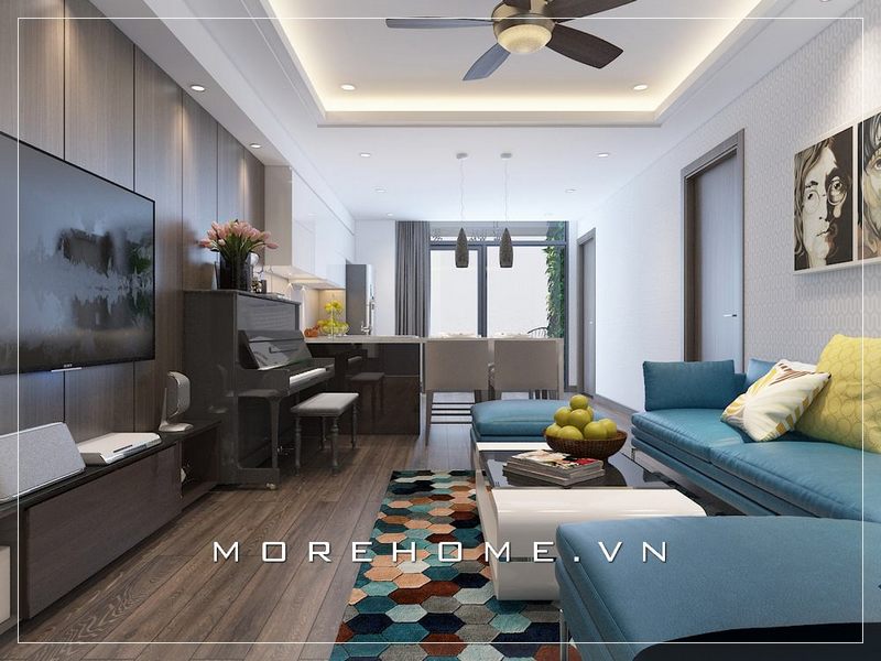 Không gian phòng khách chung cư được tiết kiệm tối đa với mẫu sofa kiểu góc tiện lợi và phong cách hiện đại trẻ trung vừa độc đáo với màu xanh đầy sức sống.