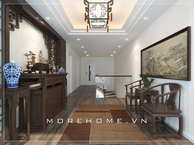 Mẫu thiết kế phòng thờ biệt thự đẹp có bàn thờ gỗ hiện đại kết hợp với bộ bàn ghế gỗ cao cấp và bức tranh ấn tượng, tạo nên không gian thờ cúng lí tưởng.