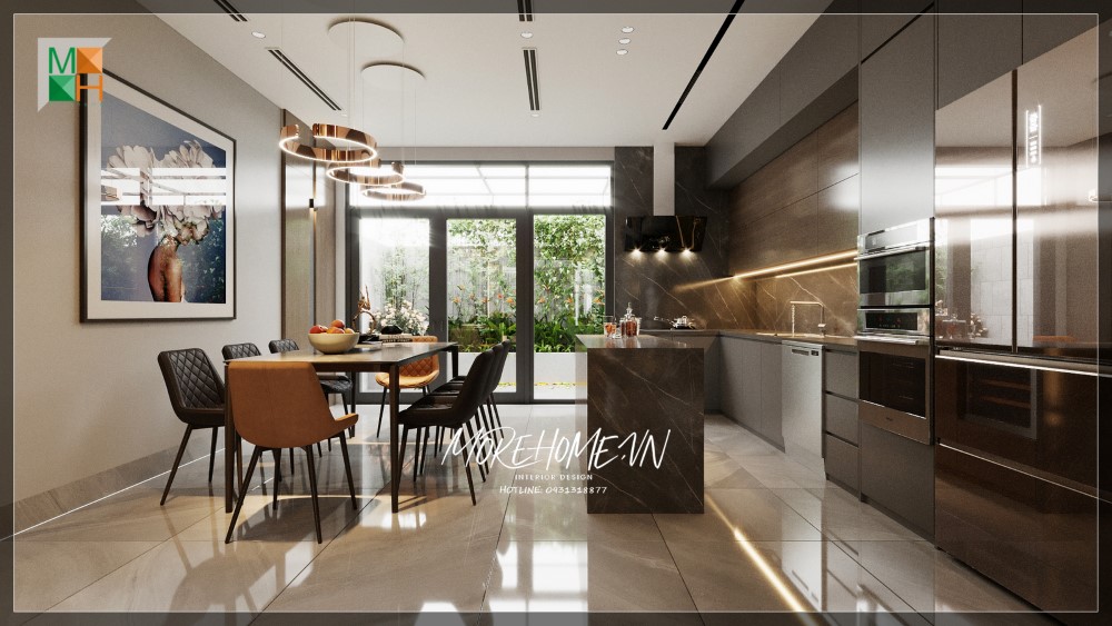 Bộ bàn ghế và tủ bếp được làm từ gỗ óc chó tự nhiên tạo nên một vẻ đẹp đồng nhất nhưng vẫn mang lại sự độc đáo trong gian bếp hiện đại.