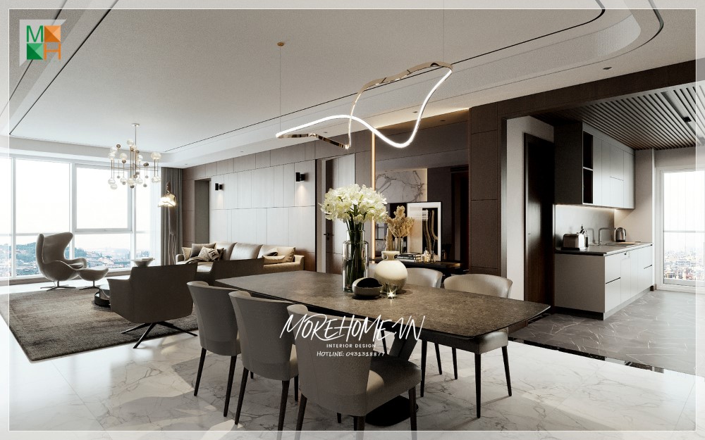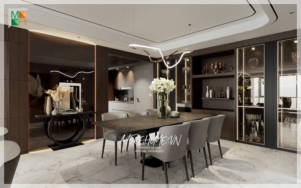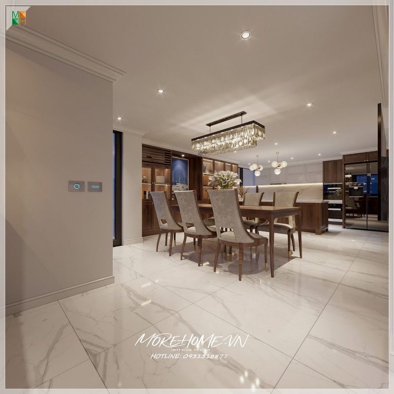 Phòng ăn liền bếp có diện tích rộng rãi, thoáng đãng và được trang bị nhiều tiện nghi thẩm mỹ cao.